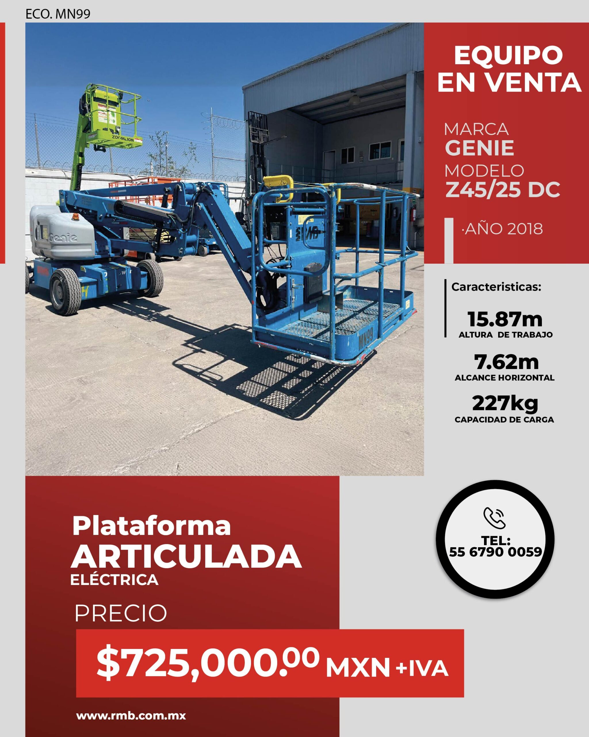 Impulsa tu productividad en obra con la Genie Z45/25 DC 2018, una plataforma articulada eléctrica ideal para trabajos en interiores y exteriores donde se requiere alcance, maniobrabilidad y cero emisiones.