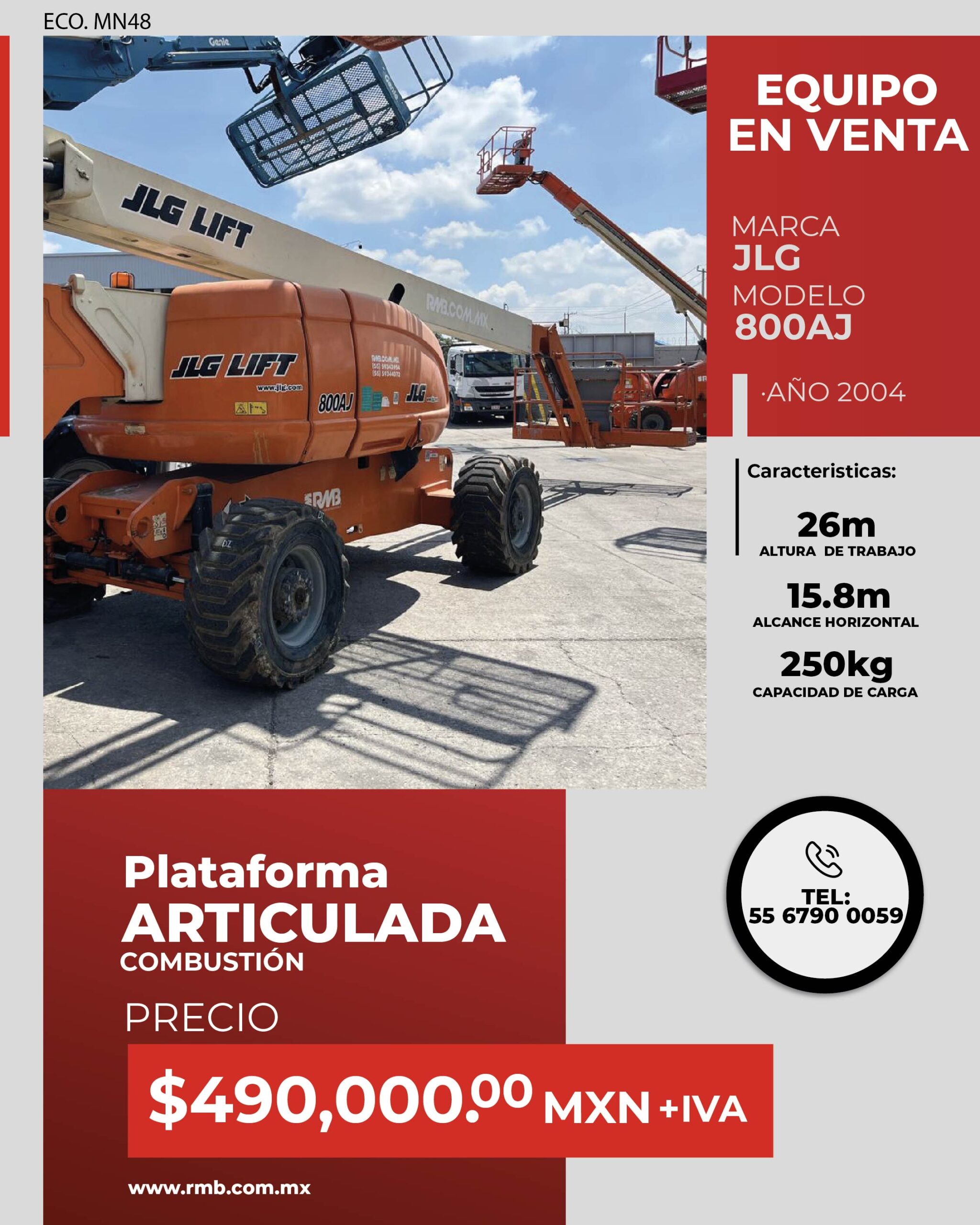 La Plataforma articulada combustión JLG 800 AJ ofrece una solución confiable para realizar trabajos en altura de manera segura y eficiente. Con un diseño robusto y versátil, este equipo es ideal para proyectos de construcción, mantenimiento e inspección en diferentes tipos de terrenos.