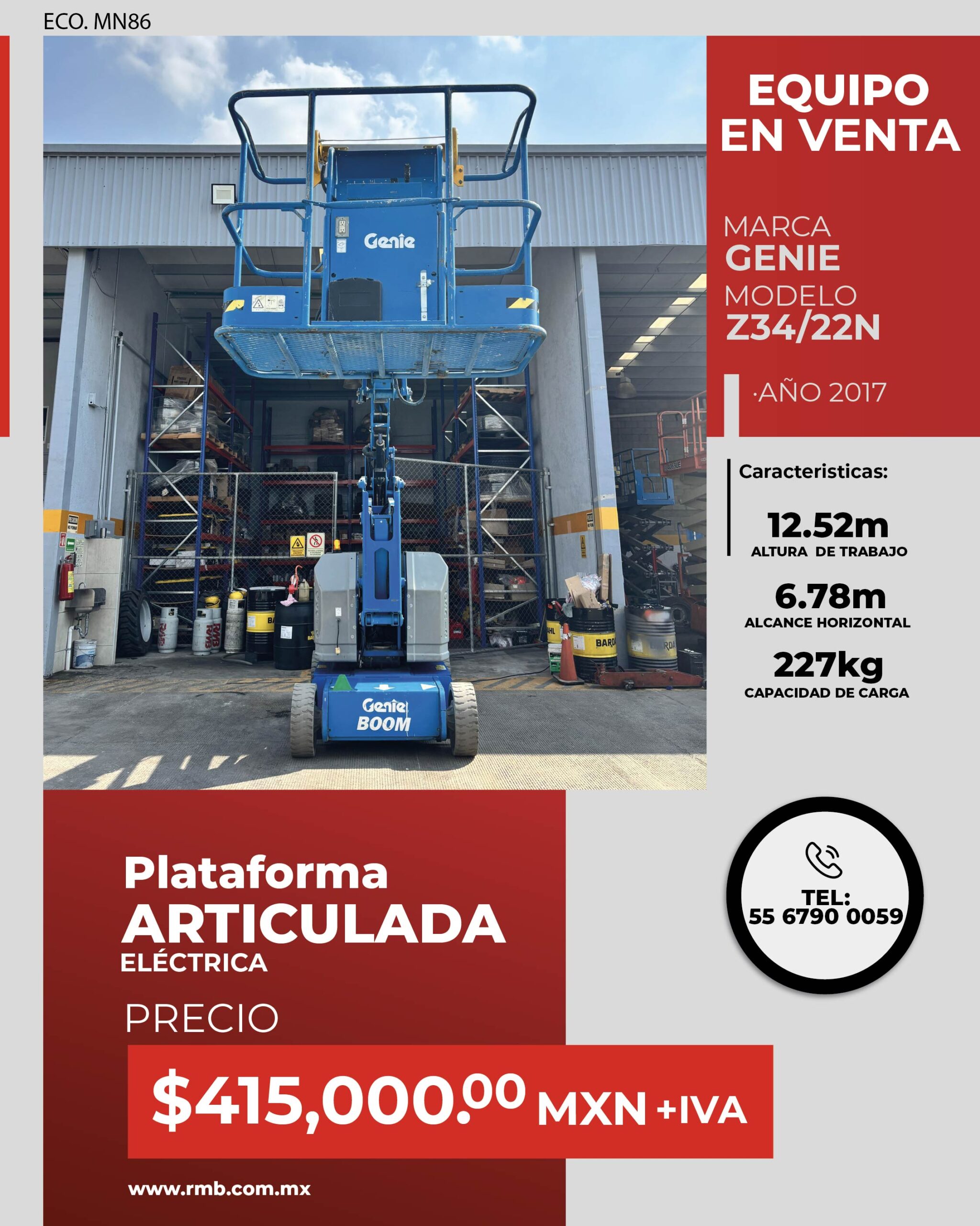 Optimiza tus proyectos en altura con la plataforma articulada eléctrica Genie Z34/22N 2017, diseñada para trabajos en interiores y espacios reducidos donde la precisión y eficiencia son clave.