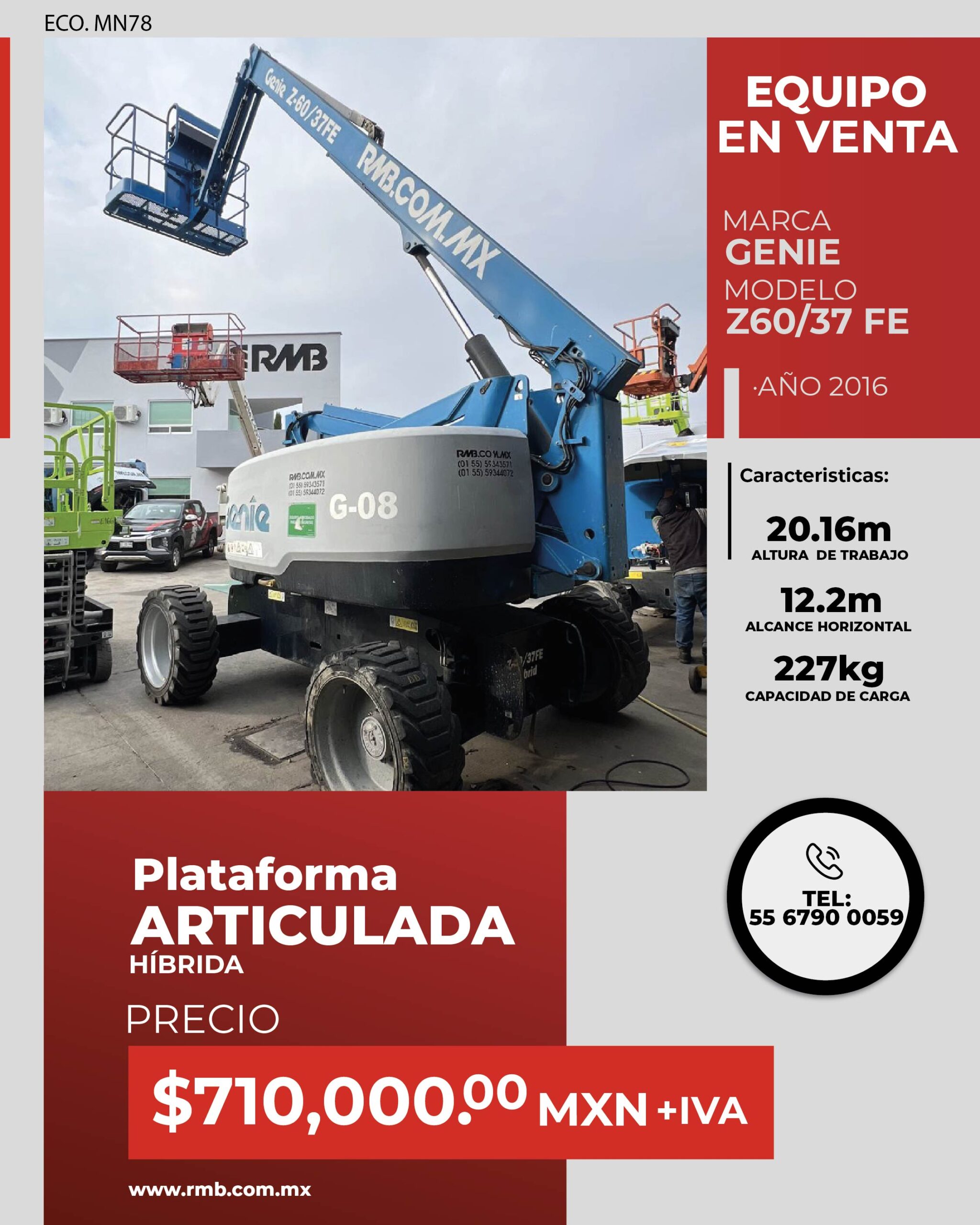 Optimiza tus proyectos en altura con la Plataforma Articulada Híbrida Genie Z60/37 FE 2016, diseñada para ofrecer máximo rendimiento, eficiencia energética y versatilidad en obra. Este modelo combina lo mejor de la tecnología eléctrica y diésel, ideal para trabajos en construcción, mantenimiento industrial y proyectos exigentes.