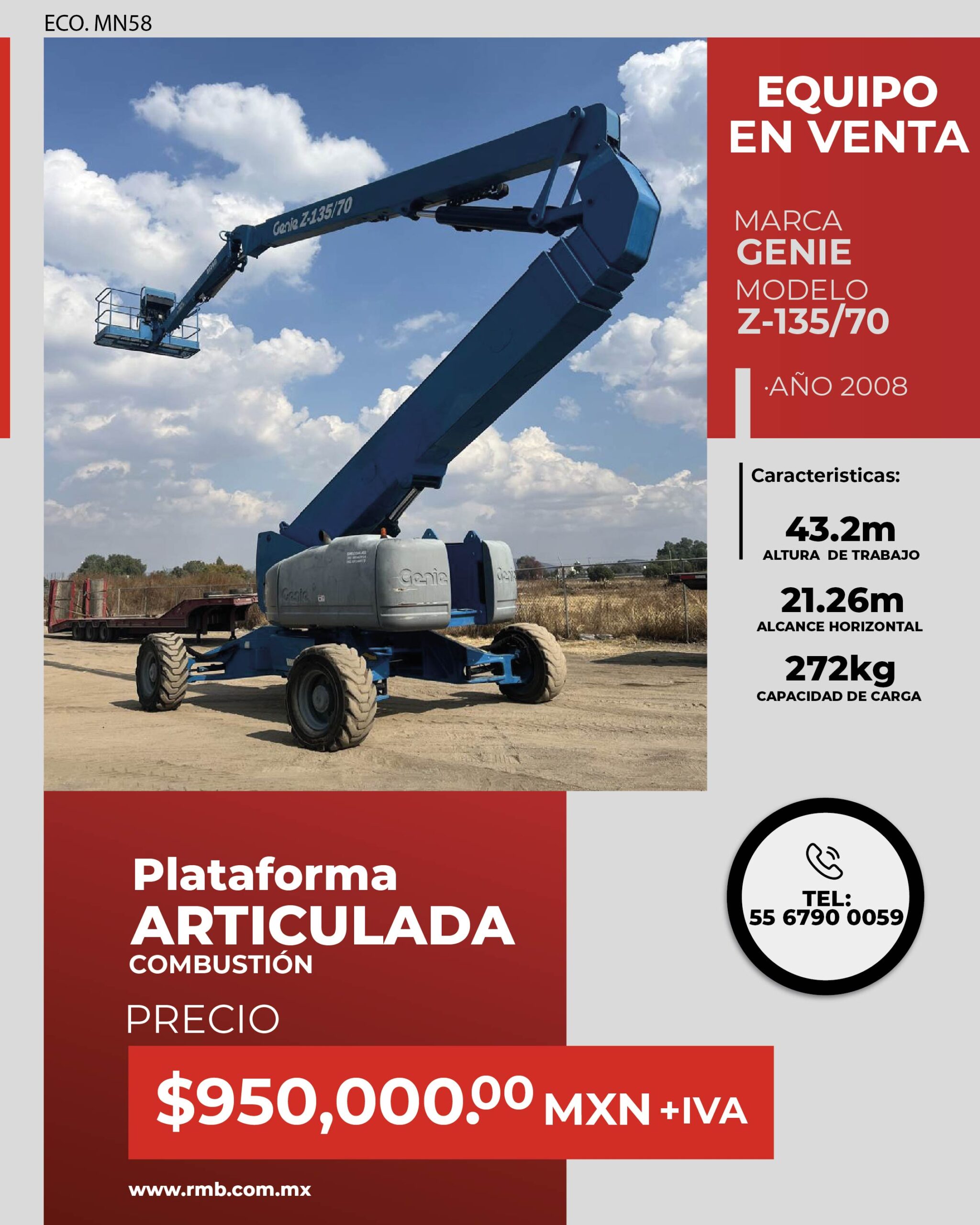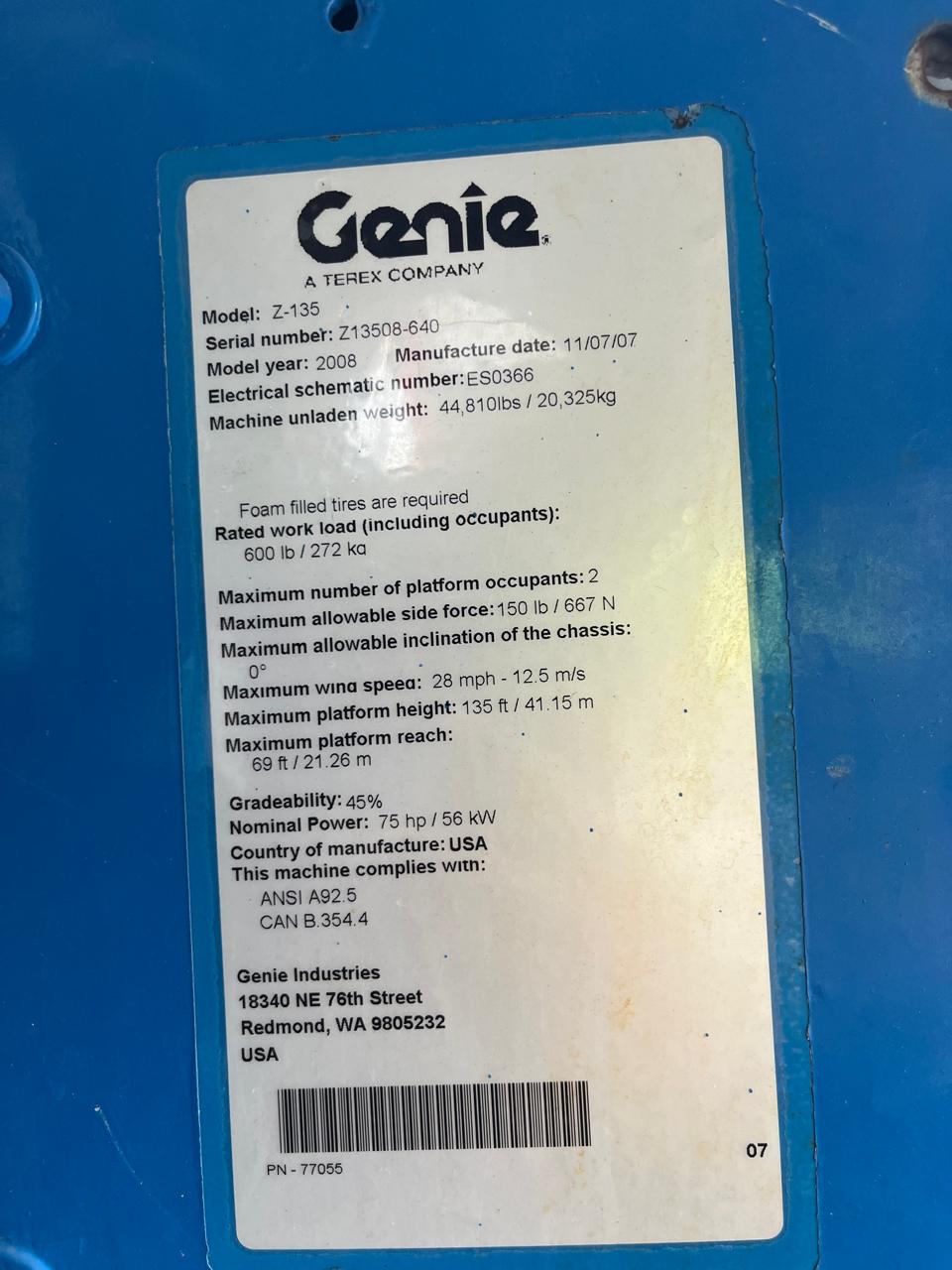 La Plataforma articulada Genie Z-135/70 2008 de combustión es la solución ideal para trabajos en altura que requieren alcance extremo, potencia y maniobrabilidad en terrenos exigentes.